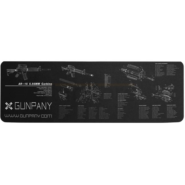 Die Vector Optics SCBM-01 Reinigungsmatte zeigt eine Explosionszeichnung der AR-15 mit vollständiger Teileliste auf schwarzer, geruchloser Oberfläche. Hergestellt aus weichem Gummi mit ölresistenter Polyester-Oberfläche, rutschfest auf der Unterseite; Maße: 915 × 305 mm.