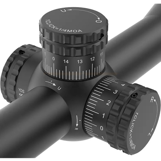 - Türme: 1/4 MOA Klick, ±50 MOA Verstellung, Null‑Reset mit Verriegelung