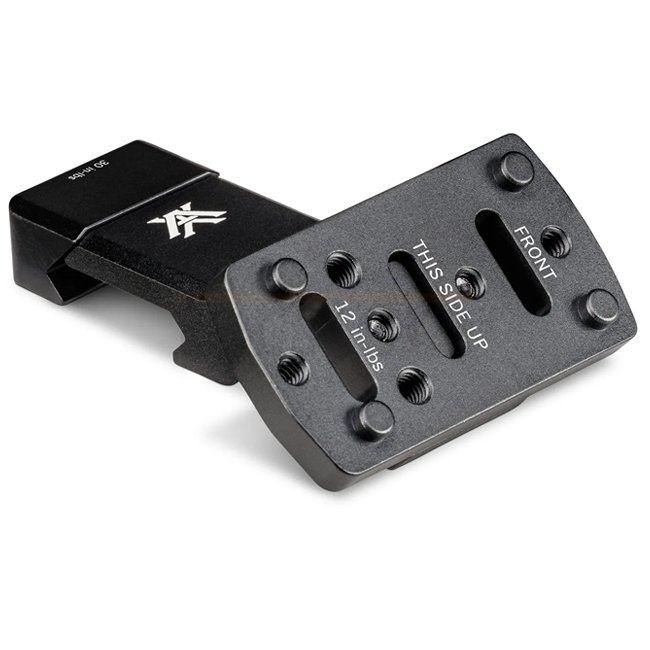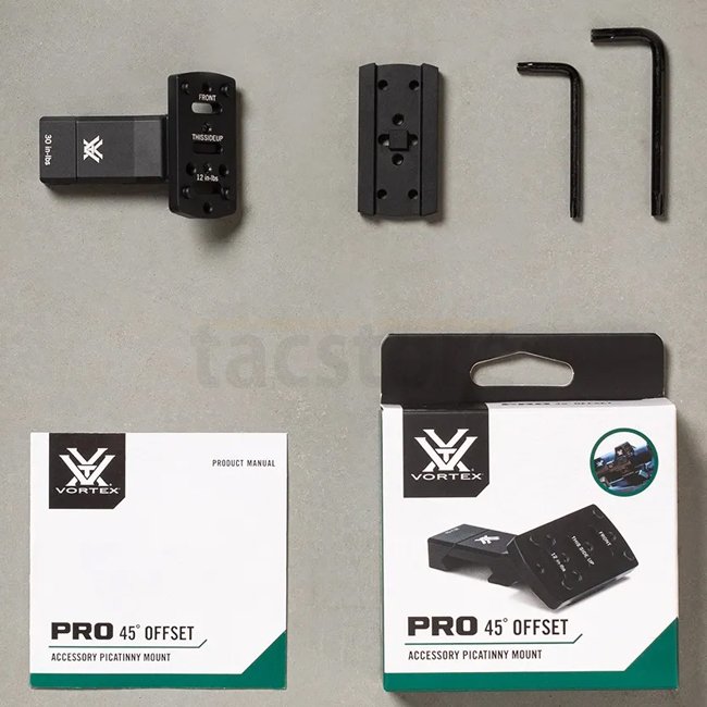 Die Vortex Pro 45° Offset Accessory Picatinny Mount ermöglicht es, ein Red-Dot oder anderes Zubehör im 45° Winkel zur Schiene zu montieren. So kann schnell zwischen primärem und sekundärem Visier gewechselt werden, ohne Griff oder Kopfposition verändern zu müssen.