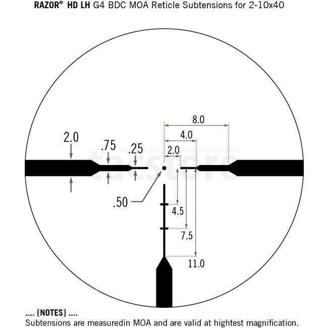 Vortex Optics Razor HD LH 2-10x40 Zielfernrohr G4 BDC MOA ist ein hochwertiges Zielfernrohr mit einem Vergrößerungsbereich von 2x bis 10x, einem Objektivdurchmesser von 40mm und einer Augenentlastung von 96mm. Es verfügt über gekapselte Türme, eine Einste