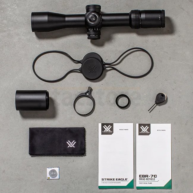 Vortex Optics Strike Eagle 3-18x44 FFP Zielfernrohr ist ein hochwertiges Zielfernrohr mit 3-18-facher Vergrößerung und einer 44mm Objektivlinse. Es verfügt über einen freiliegenden Höhen- und einen abgedeckten Seitenwind-Turmstil, 1/4 MOA Verstellgrad und