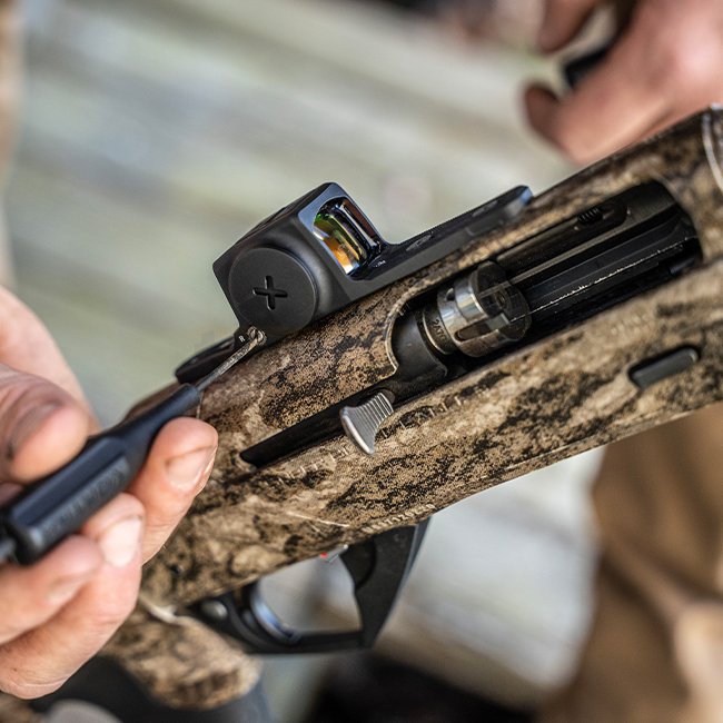 • Integriertes universelles Montagesystem: Für vorgebohrte und mit Gewinde versehene Schrotflinten-Receiver.