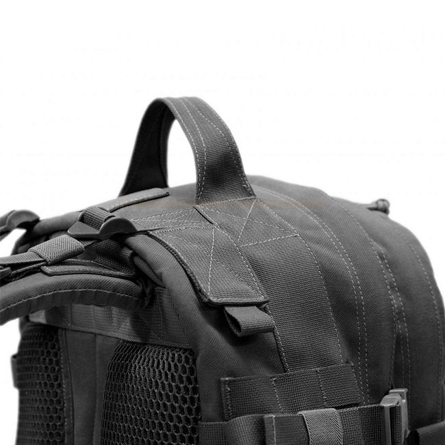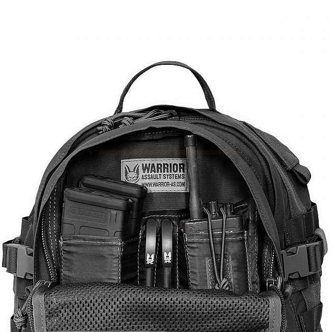 Innen findet sich eine Aufnahme für Trinksysteme die für die Befestigung verschiedener Taschen mit Gurtband versehen ist. Der obere Teil des Packs verfügt auf beiden Seiten des Schwerlast-Tragegriffs über Antenne und Trinkschlauch-Durchführungen.