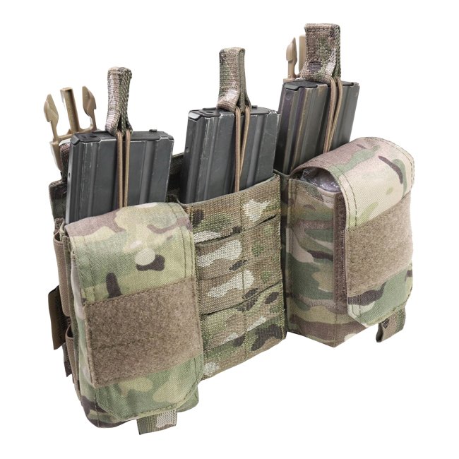 Das abnehmbare Frontpanel MK1 von Warrior Assault Systems wurde für die Kompatibilität mit der gesamten Palette von Warrior Plattenträgern entwickelt, einschließlich LPC und RPC. Es wird schnell über Klettverschluss und Schnellverschlüsse an der Vorderseite des Trägers befestigt. Das Panel besteht aus drei Magazintaschen mit verstellbarer Bungee-Retention, die 5,56-mm-NATO-Magazine aufnehmen und auch auf AK-7,62-mm-Magazine angepasst werden können. Zusätzlich verfügt es über zwei kleine Zubehörtaschen mit Klettlaschen zur Anbringung von Patches. Die Vorderseite der verbleibenden Magazintasche ist mit MOLLE-Gurtband ausgestattet, das die Anbringung zusätzlicher Taschen ermöglicht. Elastische Schlaufen auf beiden Seiten bieten Platz für Chemielichter, kleine Taschenlampen oder Kabelbinder.