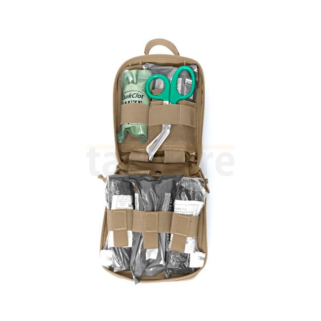 Elastische Fächer halten das medizinische Zubehör geordnet nach Priorität. Es passen 2 C.A.Ts, 2 Kompressionsverbände, 2 Quick Clot-Gazen, Atemhilfen, Schere und Chest Seals hinein.