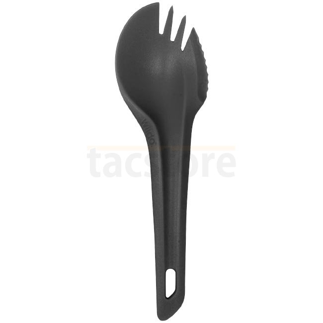 Kompaktes und ergonomisches Essbesteck welches Gabel, Messer und Löffel in einem vereint. Gefertigt aus leichtem und widerstandsfähigem Kunststoff.