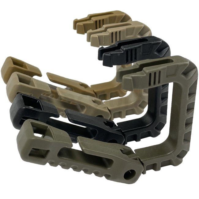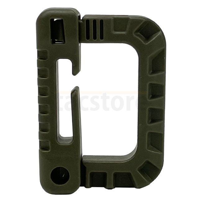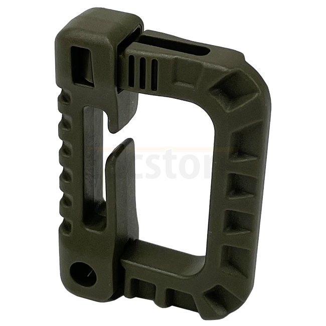 Hochbelastbarer Kunststoffkarabiner, der für eine schnelle Befestigung von Ausrüstung am MOLLE-System entwickelt wurde. Abmessungen 50 x 38 x 12 mm, maximale Gurtbandbreite 25 mm / 1 Zoll. Nicht geeignet für Klettern oder Rettungsmissionen.